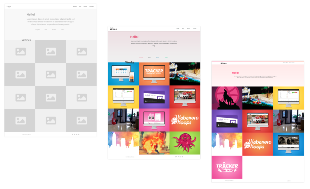 My original site was created roughly 2 years ago as I was getting prepared to start applying for my first jobs. My experience with HTML/CSS was… undeveloped and in that time I have been able to practice A LOT. That original site was incredibly minimal mostly by choice. (HA!) I wanted to keep my site fairly plain to let the work do the most of the talking and best draw the eyes.