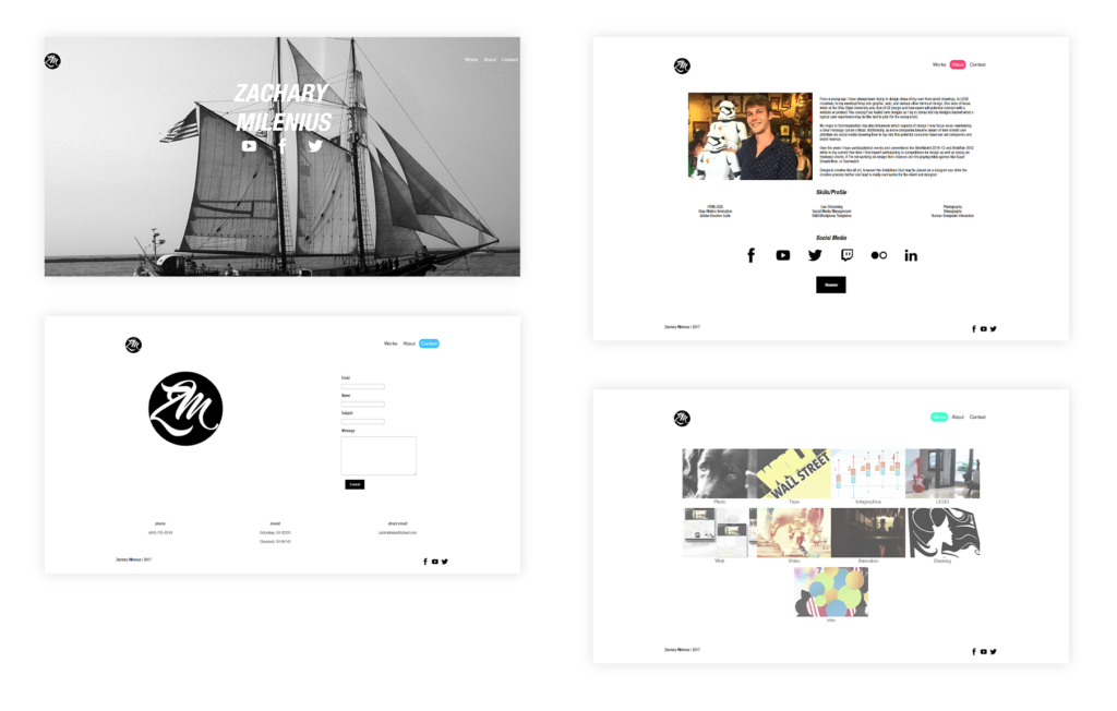 The about page went mostly unchanged from initial mockups to final design, however I ended up removing the social media links since they are above the fold on most desktops and my mobile nav includes them. I thought this would help bring attention to the main point of the page, housing my resume.